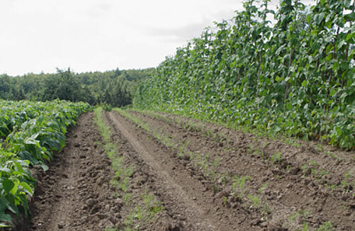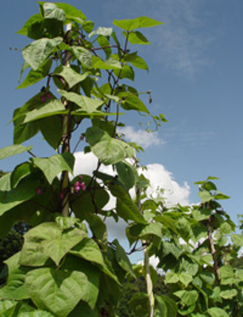 In langen Reihen stehen die Stangenbohnen auf dem Acker