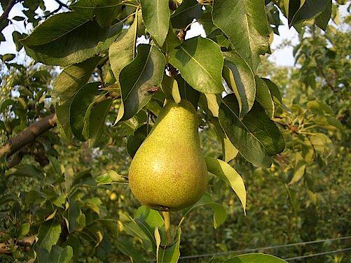 Um die geht es heute. Eine schöne Birne mit roten Wangen. Wohlschmeckend, süß und aromatisch. Hat nicht jeder. Beim Südhof wächst sie noch auf hohen Bäumen. Die Vögel danken es. Die Landschaft auch.