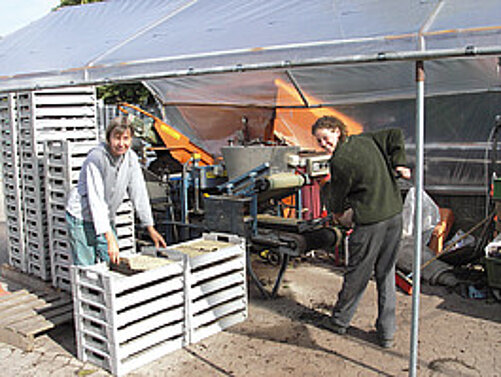 Hier werden Erdtöpfe gepresst